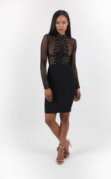 An intricate lace with sexy long sleeve fishnet mesh dress pulled together with our signature think bandage material. A long sleeved black bandage dress with style features such a high neck and gold beading bring added comfort and style, simply gorgeous!
