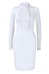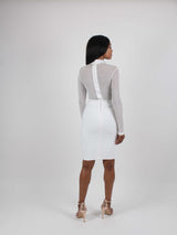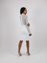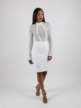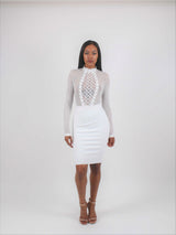 This dress will allow you to take charge in the boardroom or the bedroom, with the style and class to match. The thick, bandage material shows your curves off effortlessly. The lace and mesh allow you to feel confident and sexy, while the gold detailing and high round neck will allow you to feel elegant and graceful. This dress comes in three colours: white, black, and blush. Find the colour that you will fill you with power and order it. You will not regret it. The dress is dry clean only. Check our size chart for your perfect fit! .
