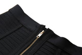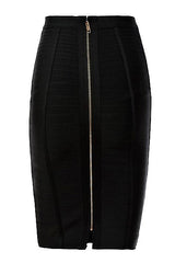 Elevate your wardrobe with the "Ava" Black Panelled Bandage Skirt with Full Gold Zip—a sophisticated, sultry piece that embodies both style and elegance. Shop now and add this timeless piece to your collection!
