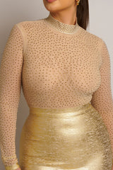 The 'Rachel' Nude Bandage Dress; sparkle in spotlight in this gorgeous evening bandage dress! Red Wine mesh long sleeve bandage dress featuring stud embellishment, high neck cut and crafted from our luxury bandage material. This dress will spice up any evening out!
